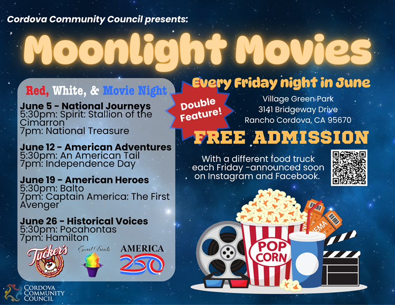 Our Summer Series has become as much a part of a Rancho Cordova summer as floating down the American River. This is a series of “FREE Friday nights out” that will keep you happily entertained throughout the summer. In June, Moonlight Movies returns with some All-American favorites, just in time for the Semiquincentennial. Watch for America 250 giveaway specials.