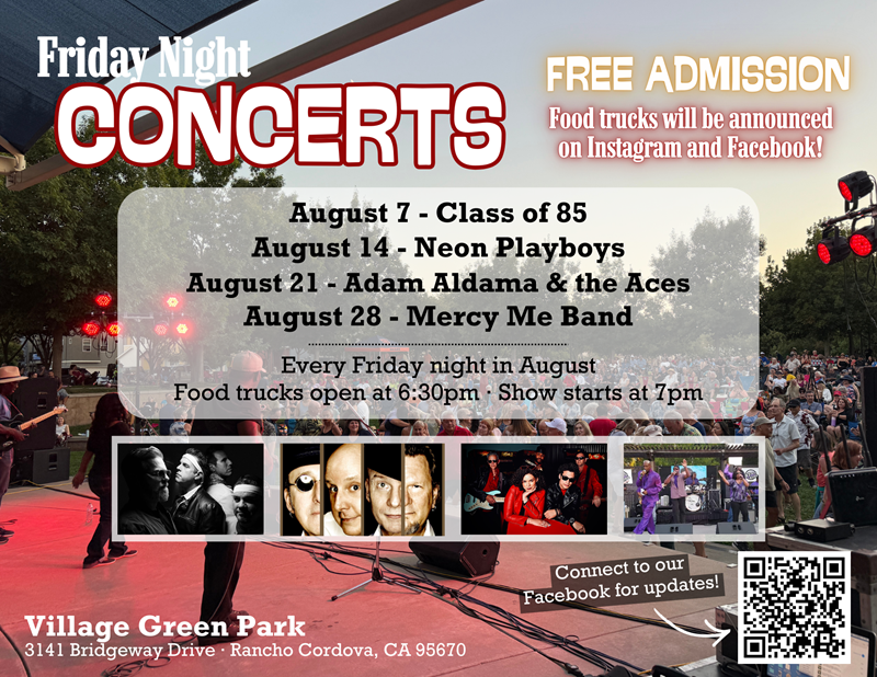 Our Summer Series has become as much a part of a Rancho Cordova summer as floating down the American River. This is a series of “FREE Friday nights out” that will keep you happily entertained throughout the summer. We rock the month of August away during our Friday Night Concerts.